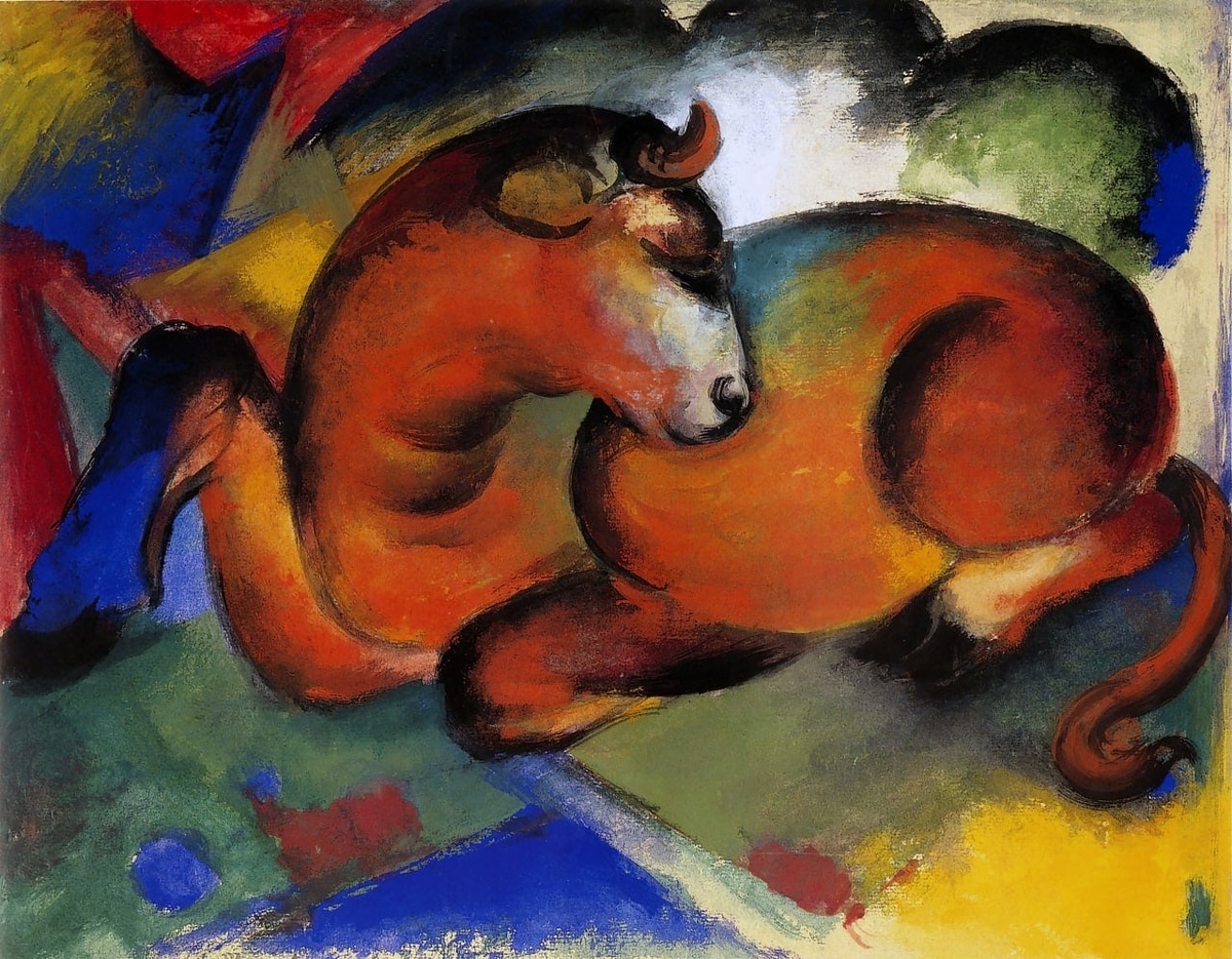 Для родителей и школьников: Картина «Красный бык» была написана немецким художником-экспрессионистом Францем Марком в 1912 году. Это одна из самых известных его работ, хотя её размер совсем небольшой — всего 34 на 43 сантиметра. Сейчас картина хранится в Государственном музее изобразительных искусств имени А.С. Пушкина в Москве. На картине изображен мощный бык, который лежит на земле. Его тело написано ярко-красным цветом и обведено выразительными черными контурами. Фон состоит из абстрактных разноцветных форм — синих, зеленых, желтых и оранжевых пятен, которые создают ощущение движения и энергии. Франц Марк был представителем экспрессионизма — направления в искусстве, где главное не реалистичность, а выражение эмоций через яркие, нереальные цвета, упрощенные и деформированные формы, энергичные мазки кисти. Художник разработал собственную цветовую символику: Красный для него был цветом жизненной силы, энергии и мощи. Синий означал духовность и мудрость. Желтый символизировал нежн