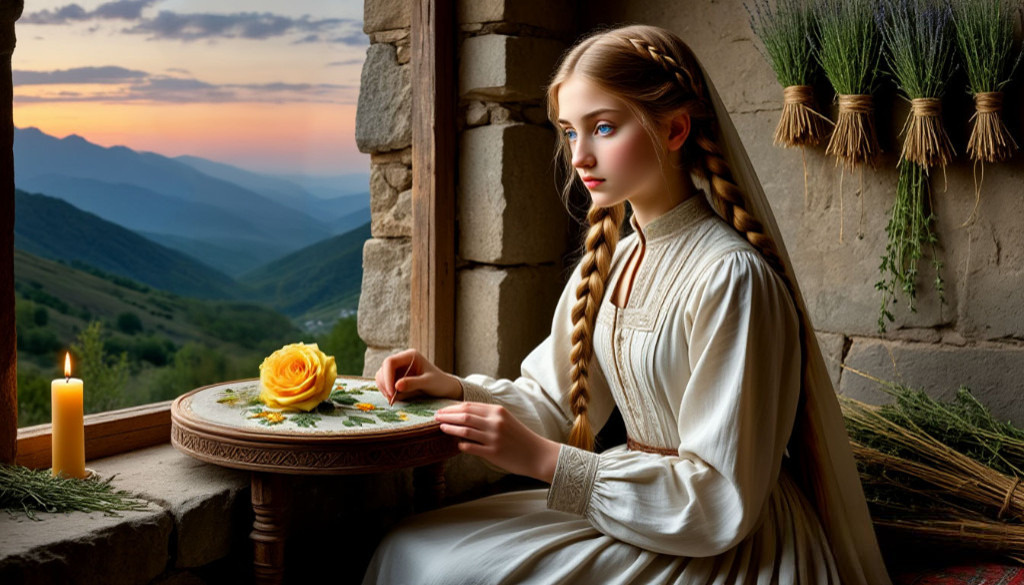 «Жизнь моя угасала вместе с закатом… Тёмно-янтарные лучи солнца пробивались сквозь высокое окно, заливая комнату мягким светом. Тончайшее дыхание вечера проникало в башню. Вокруг стоял лёгкий дух полевых трав, принесённый ветром... Я сидела, склонившись над пяльцами, и пыталась вывести на тонком полотне дикую розу — такую, какую я когда-то, ещё ребёнком, трогала осторожно в тенистых перелесках дальнего ущелья, под треск кузнечиков и свист перепёлок.... Сердце моё сжималось от боли, сладкой и невыносимой, и от этого игла упрямо не слушалась, двигалась в моих руках медленно и неуверенно, а мысли всё улетали, уносились к тому, кто стал для меня и светом, и печалью... Они витали за пределами комнаты — где-то там, средь высоких гор и глубоких долин, играл на своём пандури Жаворонок, а моё сердце трепетало перед ним от неясных желаний и несбыточных надежд, и в каждый стежок само собой вплеталось его имя.