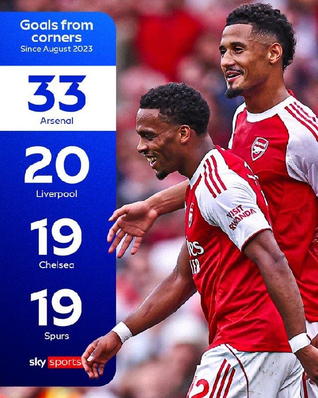"Арсенал" — абсолютный лидер по количеству голов после угловых в Премьер-Лиге за последние два года. Сегодня +2 🔝