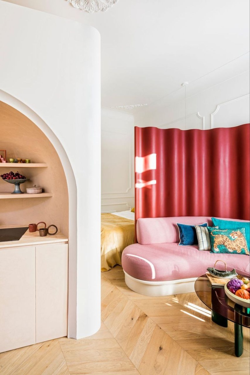 Неожиданный красный: волнообразный экран придает небольшой квартире структуру и стиль с помощью модного красного цвета