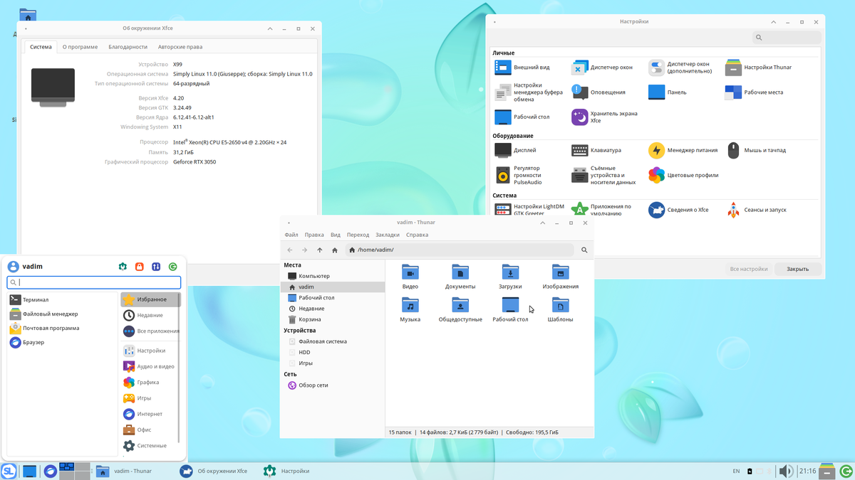 В качестве окружения рабочего стола в Симпли всегда использовалась среда рабочего стола XFCE, она меньше Gnome и KDE нагружает железо, в первую очередь по видеоподсистеме, по оперативной памяти разрыв между оболочками сократился довольно существенно к нынешнему времени.