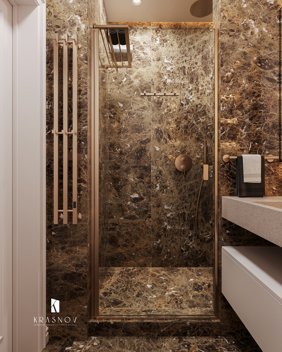 Когда мы говорим «санузел», большинство людей сразу представляют стандарт: белый кафель, зеркало, минимум деталей. Но современный интерьер давно вышел за эти рамки. Санузел сегодня — это не только про функционал, но и про эмоцию. Это должно быть пространство, в котором приятно задержаться, а не просто «помещение для гигиены». В этом проекте главная роль отдана керамограниту под тёмный мрамор. Глубокий шоколадный оттенок с янтарными прожилками создаёт атмосферу премиального SPA. Такой камень «заземляет» интерьер, добавляет глубины и статуса.