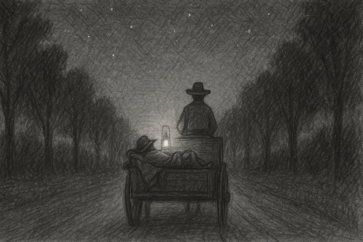 И аллея, по которой они неспешно катились, становилась всё мрачнее и мрачнее. Кроны яблонь превращались в демонические руки, торчащие из земли. Тьма перед повозкой начала обретать формы, напоминая путь в само чистилище.