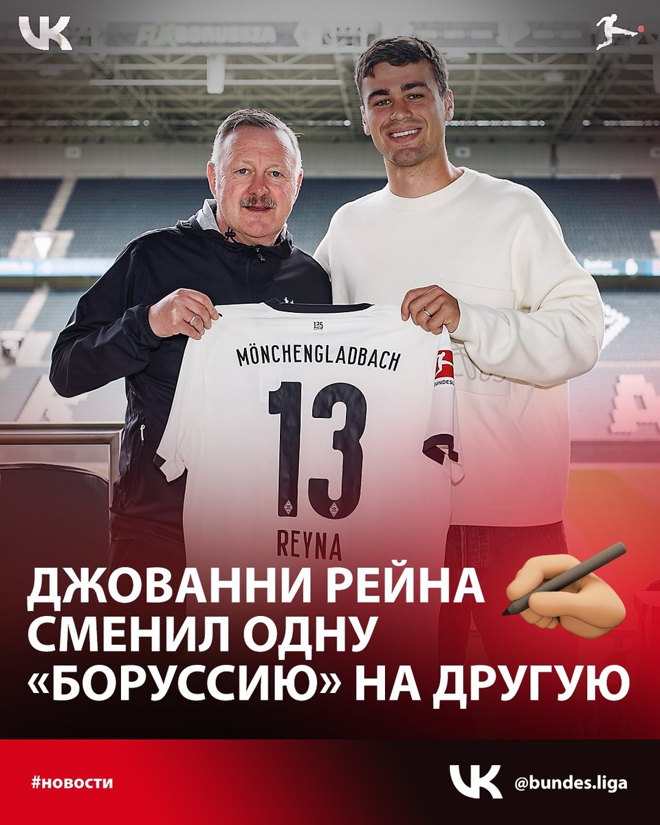 🤔 Джованни Рейна сменил одну «Боруссию» на другую... 22-летний атакующий полузащитник дортмундской «Боруссии» Джованни Рейна стал игроком «Боруссии» из Мёнхенгладбаха. Трансфер оценивается в 4 млн евро, контракт подписан на 1 год ✍