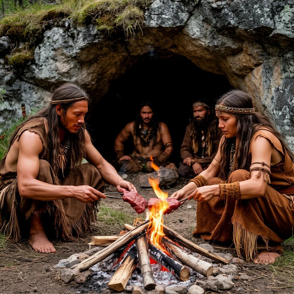 Костер яркими языками пламени устремился ввысь, охотники стучали копьями. Женщины отрезали куски мяса с туши убитого накануне кабана.
