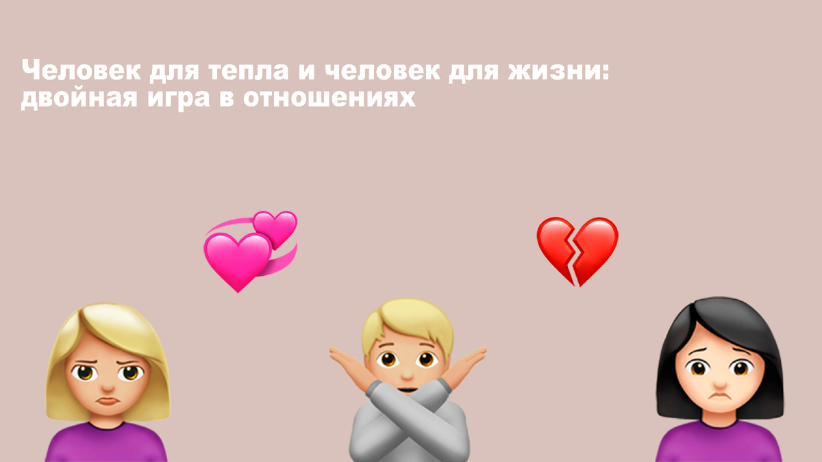 Двойная игра с «человеком для тепла» и «человеком для жизни» - это не просто вопрос выбора партнёров, а отражение внутренних страхов, незрелости и поисков эмоционального комфорта. Такие ситуации болезненны для всех участников: «запасной» страдает от ощущения ненужности, основной партнёр - от сомнений и вины, а человек, который ведёт двойную игру, живёт раздвоением.