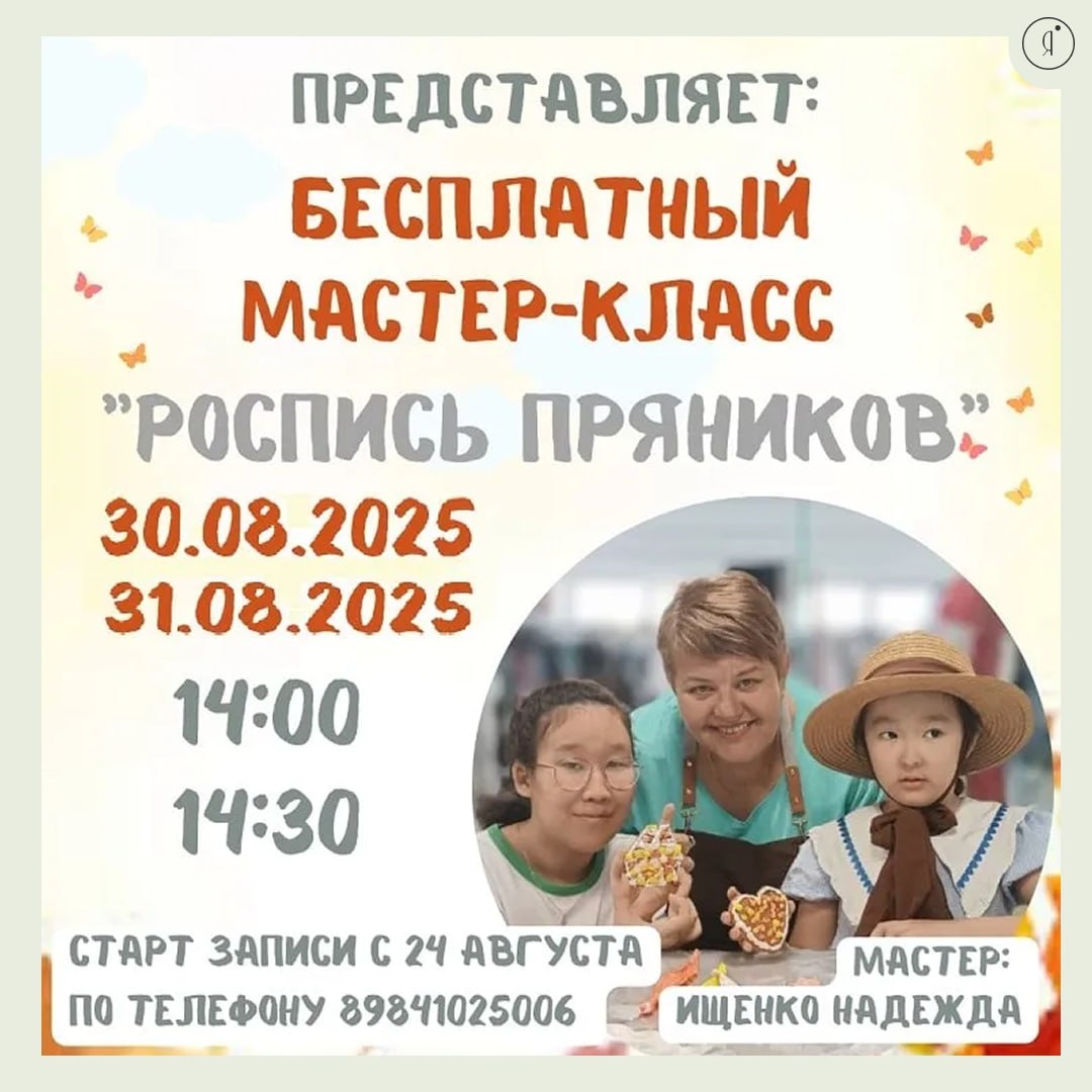 Бесплатный мастер класс «Роспись пряника» #МК Мастер-класс рассчитан для детей от 3 до 14 лет Что ждёт ребят? 🤩 Научитесь создавать яркие узоры и оригинальные рисунки на настоящих русских пряниках 🤩 почувствуете атмосферу домашнего праздника и вдохновения 🤩 получите советы профессионального художника-кондитера 🤩 попробуете созданные своими руками кулинарные произведения искусства 30-31 августа | 14:00 | 14:30 ТЦ «1000 мелочей», Октябрьская, 25 По записи: +7 (984) 102-5006 Online Якутия | Подписаться