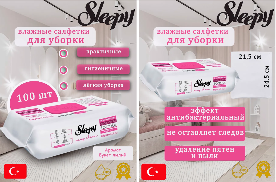Они идут в большой упаковке на 100 штук, и есть удобный клапан, чтобы салфетки не высыхали. Производитель обещает, что они подходят для любых поверхностей, от мебели до сантехники, и даже унитаз можно ими протереть. Мне нравится, что они плотные и не рвутся, а ещё у них приятный аромат арабского мыла.