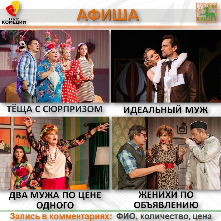 🎭 Театр Комедии, сцена на ВДНХ 📍 Проспект мира, 119, стр. 84 🟠 ТЕЩА С СЮРПРИЗОМ 31 августа в 14-00 26 августа в 19-30 2, 4, 9, 11, 16, 18, 23, 30 сентября в 19-30 7, 14, 28 сентября в 14-00 🟢 ЖЕНИХИ ПО ОБЪЯВЛЕНИЮ 31 августа в 18-00 🟠 ДВА МУЖА ПО ЦЕНЕ ОДНОГО 25, 30 августа в 19-30 1, 6, 8, 13, 15, 20, 22, 29 сентября в 19-30 27 сентября в 15-00 🟢 ИДЕАЛЬНЫЙ МУЖ 27, 29 августа в 19-30 30 августа в 14-00 3, 5, 10, 12, 17, 19, 24, 26 сентября в 19-30 6, 13 сентября в 14-00 21 сентября в 19-00 👛 950₽ вместо 4000-2500₽ 👛 700₽ вместо 2000₽ 📝 Запись в комментариях к посту: ФИО, количество, стоимость ☎️Записались? Убедитесь, что заявка принята! Обязательно звоните председателю ППО #МойТеатральныйМарафон