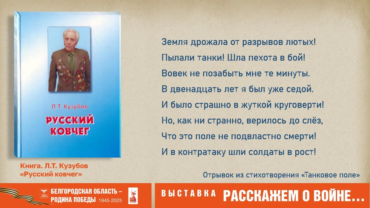 #Расскажем_о_войне... Сегодня выставка «Расскажем о войне…», посвящённая творчеству писателей-фронтовиков Белгородчины, завершает свою работу. 📘 Среди художественных произведений, посвящённых Великой Отечественной войне 1941-1945 гг., достойное место занимают поэтические сборники Леонида Трифоновича Кузубова, поэта, члена Союза писателей России, уроженца г. Шебекино. Поэтическое произведение «Танковое поле» поэт посвятил сражению на Прохоровском поле: Земля дрожала от разрывов лютых! Пылали танки! Шла пехота в бой! Вовек не позабыть мне те минуты. В двенадцать лет я был уже седой. И было страшно в жуткой круговерти! Но, как ни странно, верилось до слёз, Что это поле не подвластно смерти! И в контратаку шли солдаты в рост! ✒️ Отрывок из стихотворения «Танковое поле» #музей #БГИКМ #выставка