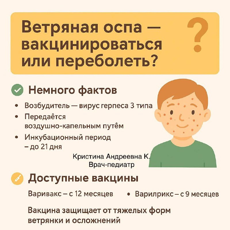 🌐Ветряная оспа — вакцинироваться или переболеть? ➖➖➖➖➖➖➖ 🚭Немного фактов ✔️Возбудитель — вирус герпеса 3 типа (Varicella Zoster). ✔️У взрослых этот же вирус может вызывать опоясывающий лишай. ✔️Передаётся воздушно-капельным путём и очень заразен — в садике или школе заболевает обычно почти вся группа/класс. ✔️Инкубационный период — до 21 дня, иногда дольше. ⚖️Вакцинировать или «переболеть»? Ветряная оспа у детей может протекать по-разному: ✅Лёгкая форма — температура 37–38 °C, немного высыпаний, которые быстро проходят без следа. ❌Тяжёлая форма — высокая температура, обильные высыпания в области лица, половых органов , рубцы (особенно заметные на лице). ❌Риск вторичной бактериальной инфекции на месте сыпи. ➡️Поэтому я за вакцинацию, особенно если она доступна в вашей поликлинике. 💉Доступные вакцины ➖Варивакс — с 12 месяцев. ➖Варилрикс — с 9 месяцев (есть не везде). ⬇️Схема вакцинации: ⏺️Если начали с 9 месяцев — 2-я доза через 3 месяца. 3️⃣Если с 12 месяцев — 2-я доза через 4–8 н