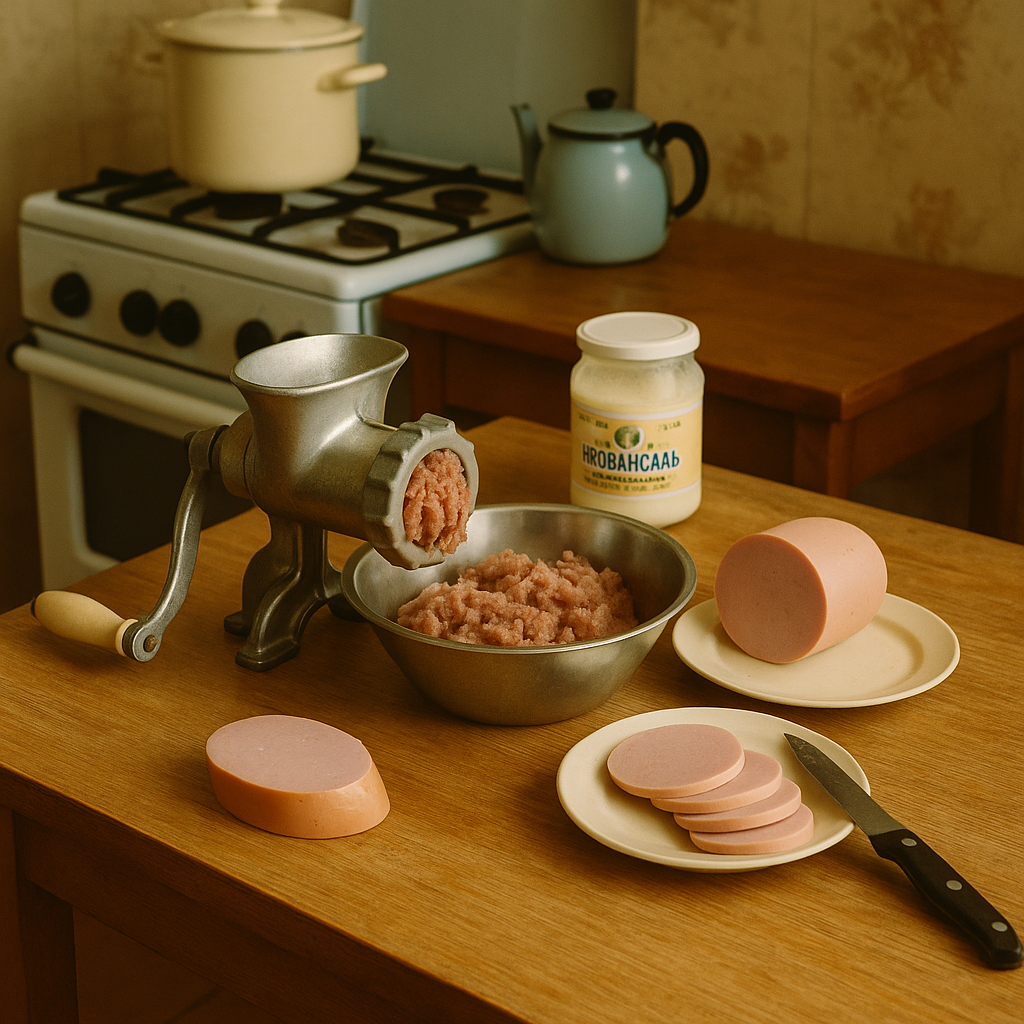 Советские хозяйки умели всё — без блендеров, комбайнов и тостеров. Главное было — колбаса и терпение. На советской кухне всё было по-настоящему. Тесто месили руками. Котлеты крутили через тяжёлую ручную мясорубку. Электромясорубки, миксеры и кухонные комбайны, конечно, существовали — но использовали их редко. Хранили как сокровище, доставали только по праздникам. Или... вообще не доставали. Почти в каждом доме был миксер. Советский. Громкий, с насадками. Но его чаще включали дети — чтобы сделать коктейль из брикета мороженого, молока и ложки варенья. Получалось не хуже, чем в гастрономе: густой, сладкий, ледяной. Маленький праздник в стакане. Электрочайник — если и был, то гудел знатно. Под его шипение вся страна слушала утреннюю гимнастику по радио. Телевизор на кухне? Неслыханная роскошь. А вот кастрюля с гречкой или борщом на газе — всегда. Колбаса — продукт стратегический. Особенно варёная. Она шла в салат, на бутерброд, в жаркое, иногда даже в суп. Считалось, что в хорошей семье в