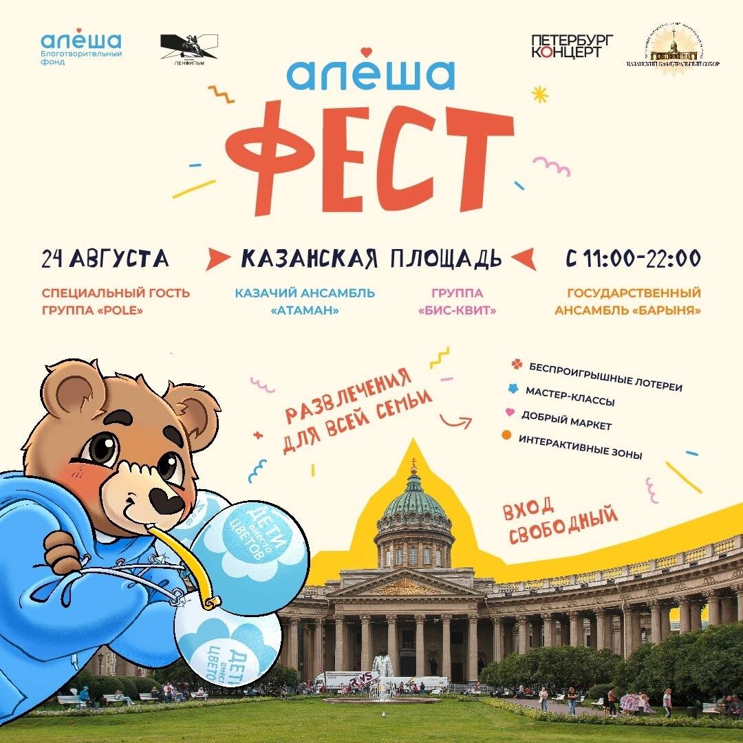 Сегодня в самом центре Санкт-Петербурга, на Казанской площади, пройдёт семейный благотворительный фестиваль «Алёша Фест», приуроченный к началу учебного года. Фестиваль организован в поддержку акции, а основная цель праздника – сбор средств на лечение главной героини акции, Вероники Вашуриной. Что вас ждёт на фестивале? Организаторы подготовили большую развлекательную программу для всей семьи. Гостей ждут интерактивные зоны, мастер-классы, развлекательное пространство от «Ленфильма», представление уличного театра петрушки «БалаганЪ», масштабный маркет добра и многое другое. А ещё на фестивале пройдет розыгрыш ценных призов! 🔵 Генеральный партнер Алеша фест: Казанский кафедральный собор.