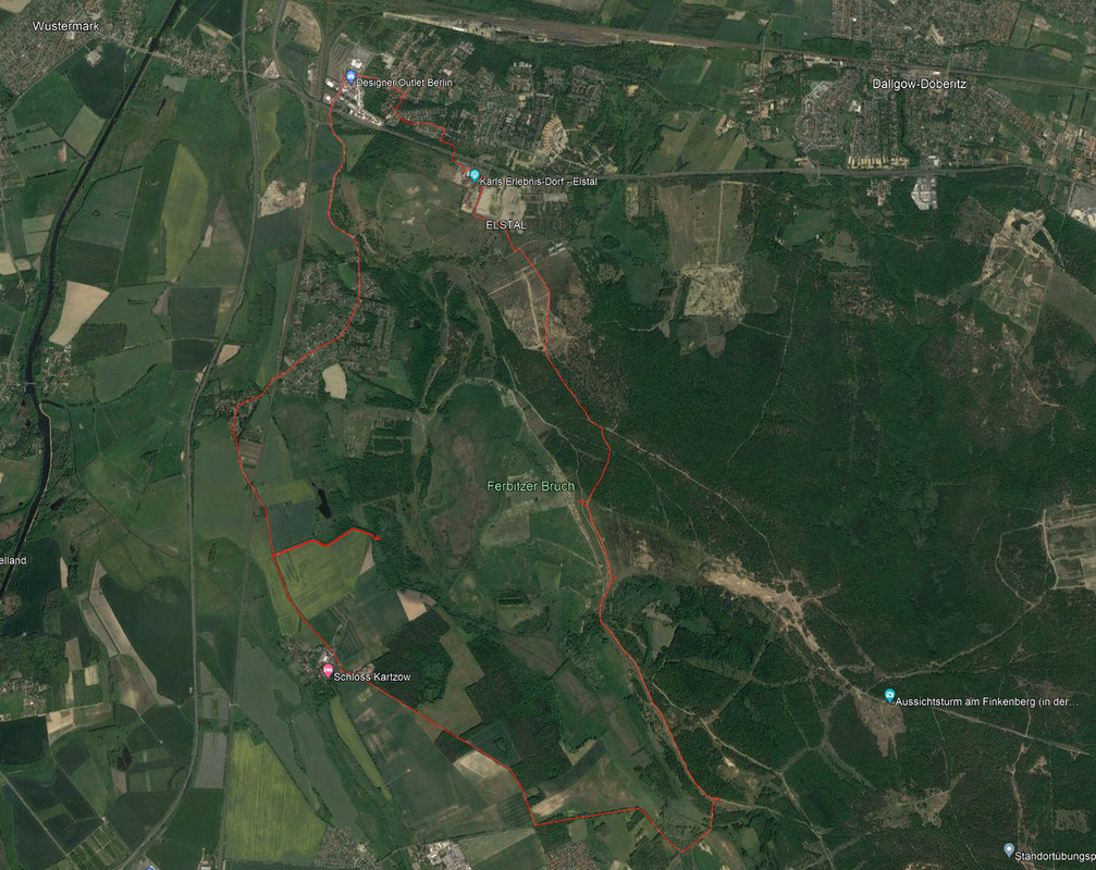 Красным отмечен мой маршрут Döberitzer Heide или Дёберитцкий бор — это огромная территория