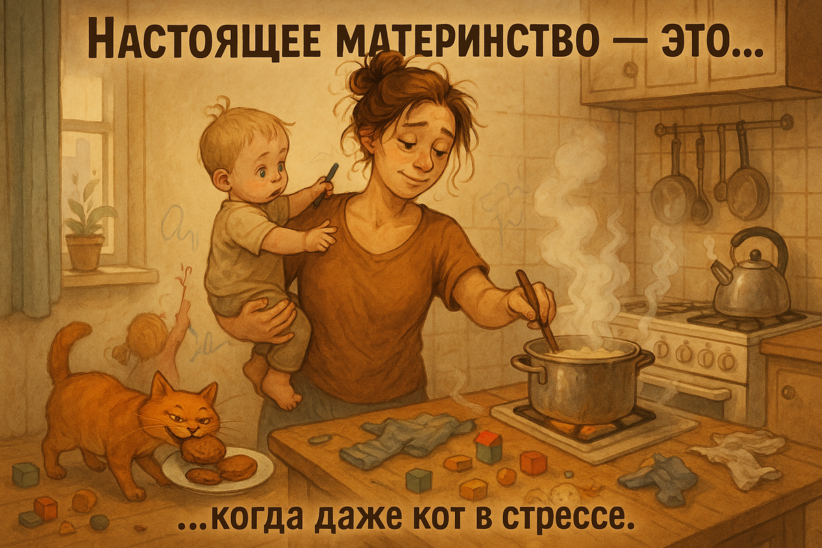 Материнство — это не картинка из рекламы с идеальной мамой в белой рубашке, которая пьёт кофе, пока ребёнок рисует солнышко. Нет. Настоящее материнство выглядит чуть иначе. ✨ Настоящее материнство — это когда у тебя всего две руки, но у тебя, как у ниндзя, работает всё тело сразу: руки, ноги, зубы, локти и даже взгляд (как отдельный инструмент выживания). Одна рука держит ребёнка, вторая мешает кашу, зубами открываешь пакет молока, одной ногой качать коляску, второй закрывать ящик с кастрюлями, головой держишь телефон и бодро отвечаешь: «Да, у нас всё хорошо», а взглядом пытаешься остановить кота, который с хитрой рожей тянет со стола котлету. И всё это под живой саундтрек: крик ребёнка, бурление каши и кошачье "мяу". ✨ Настоящее материнство — это бессонные ночи, постоянные детские истерики (и иногда — свои), бесконечное «мама, смотри!» ✨ Материнство — это когда на прогулке ты тянешь коляску, пакеты и свою усталость — и всё равно улыбаешься. ✨ Материнство — это пить остывший кофе и ра