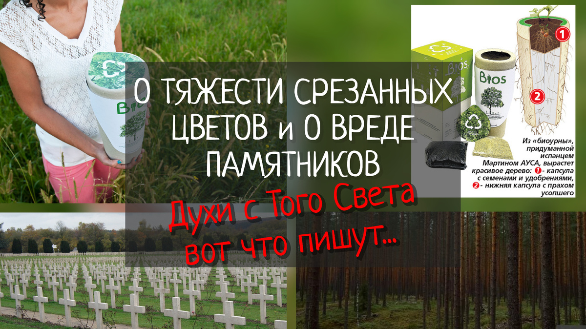 Тонкий Мир вот что пишет: • «Вырванные цветы, лишённые жизни, — это боль! Не дарите букеты мёртвых цветов — это боль и смерть. Вы дарите смерть.» • «Как вы поддерживаете умершего? Вы несёте на его могилку срезанные цветы, а зачастую искусственные. Это символы смерти. Так нельзя делать.» • «А железные памятники тянут умершего к земле! Этим металлом вы оковываете его. Не даёте выйти ему и уйти с Земли. Металл тяжёл, пластик — легче...» Это контакт «Волжской группы». Контактёр: Харитонов Геннадий Михайлович. Сеанс №47 от 20.01.1996. Их страница ВКонтакте: https://vk.com/club71641093 __________ Сейчас наконец-то стали предлагать необычный способ захоронения, возвращающий человека после смерти в лоно Матери-Природы. У славян в дохристианской Руси были «священные» рощи и дубравы, где рубить деревья не допускалось. Оказывается, это были общинные кладбища. Обряд погребения заключался в том, что на могиле, прямо над покойником, сажалось дерево, корни которого получали питание и из почвы