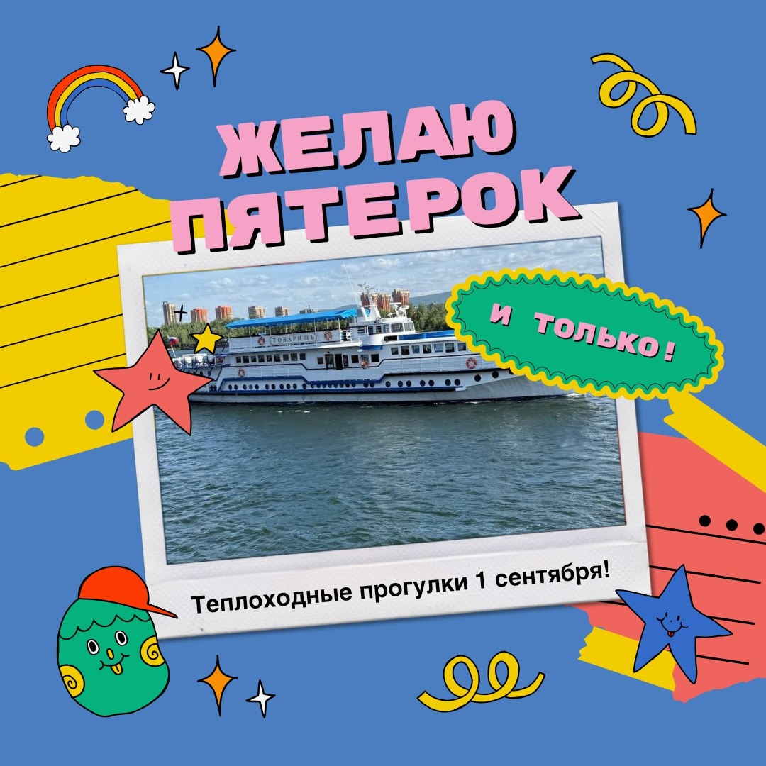 🌊🎉 Приглашаем вас на незабываемую теплоходную прогулку в честь 1 сентября на теплоходе "ТОВАРИЩЪ"! 💥 ВНИМАНИЕ! ЗАКРЫТИЕ СЕЗОНА РЕЧНЫХ ПРОГУЛОК В ЭТОМ СЕЗОНЕ! 👨👩👧👦 В этот день вы сможете насладиться экскурсионными рейсами: - с 12.30 до 14.00 - с 14.30 до 16.00 - с 16.30 до 18.00 Стоимость: - Взрослый – 1800 руб. - Пенсионеры и дети (4-12 лет) – 1600 руб. - Дети до 3 лет – БЕСПЛАТНО! 🎶 А для любителей музыки: - Музыкальные рейсы с 18.30 до 20.00 и с 20.30 до 22.00 Стоимость: - Взрослый – 1950 руб. - Пенсионеры и дети (4-12 лет) – 1800 руб. - Дети до 3 лет – БЕСПЛАТНО! Запишите дату в календарь и приходите с друзьями и семьей! 🌅✨ ❗Маршрут: от центральной набережной Енисея со стороны речного вокзала 5й причал до Свято-Успенского монастыря и обратно. 📞 Для бронирования звоните: 208-00-38, +7 (983) 508-00-38, 280-08-48, +7(913) 030-08-48, 269-08-48,+7(983) 269-08-48 (Telegram/WhatsApp). #Енисей #единыйцентртуризмакрск #красноярск