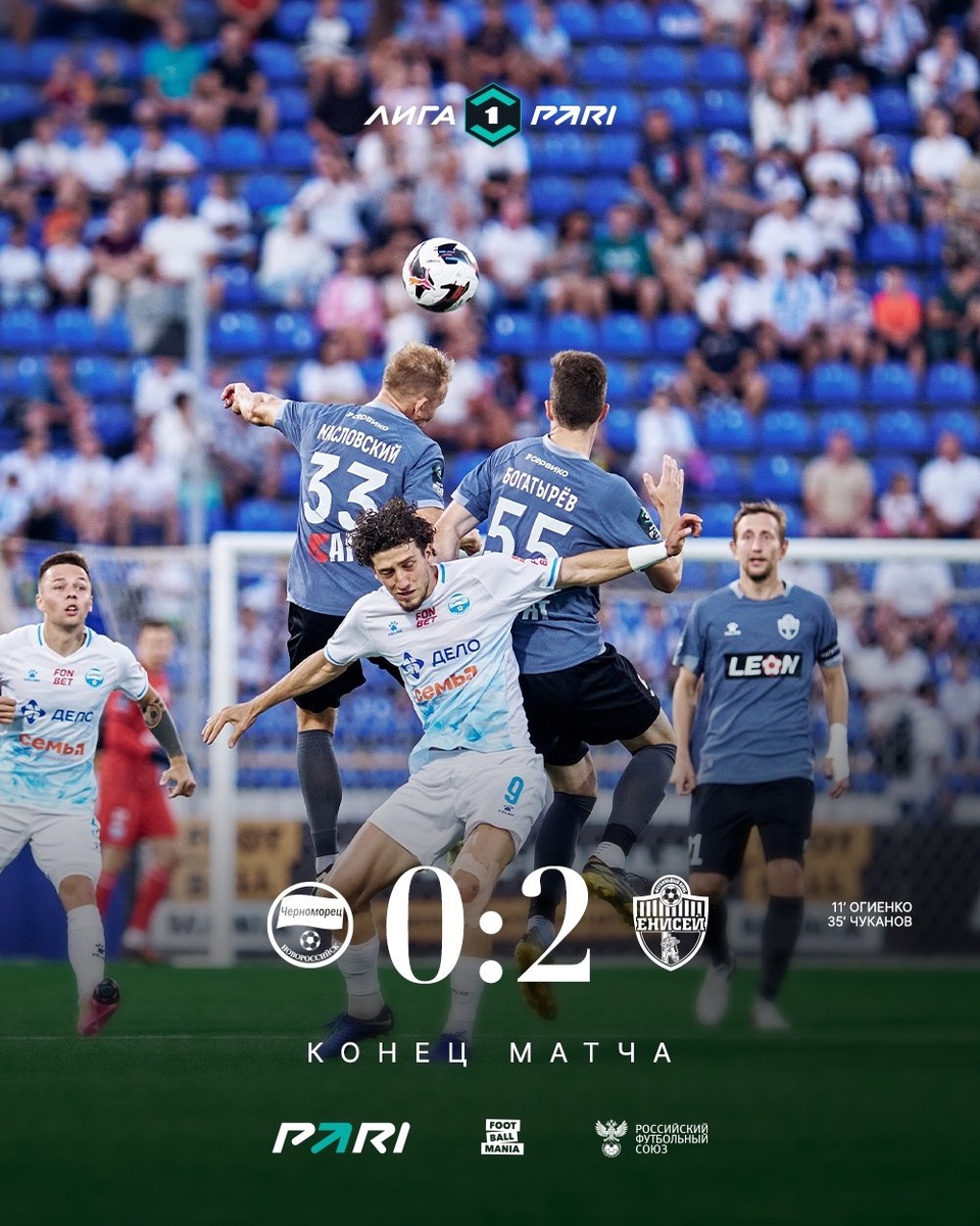 Футбольный «Енисей» одержал первую победу в нынешнем сезоне В матче 6-го тура Первой лиги красноярцы на выезде обыграли новороссийский «Черноморец» со счетом 2:0. Первый мяч в составе сибиряков на 12-й минуте дальним ударом из-за штрафной площади забил Ростислав Огиенко. А на 35-й минуте преимущество гостей удвоил Андреа Чуканов. Отметим и несколько важных спасений от вратаря нашей команды Егора Шамова. Таким образом, «Енисей» одержал первую победу в сезоне и после шести игр с пятью очками располагается на 12-м месте в турнирной таблице. При этом у ульяновской «Волги» и московского «Торпедо», которые теоретически могут обогнать красноярцев, есть ещё игра в запасе. Следующий матч «Енисей» проведёт 30 августа дома на Центральном стадионе. Соперником нашей команды станет саратовский «Сокол».