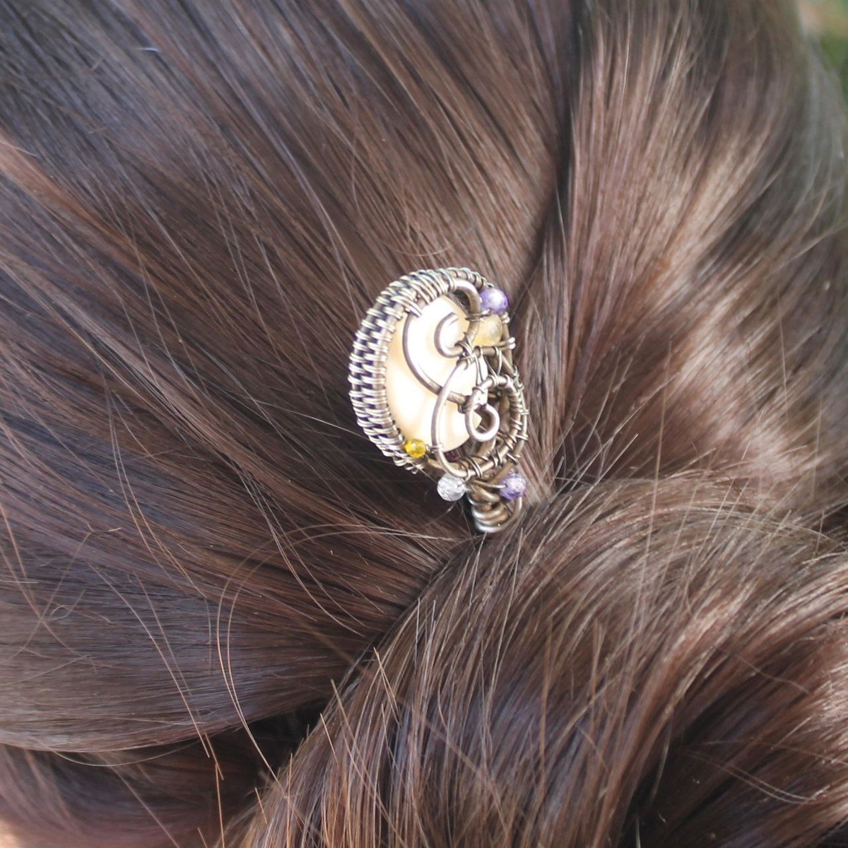 Шпилька "Т'айле", с перламутром. Плотная жесткая витая шпилька для закалывания волос. Изготовлена из нейзильбера. Нейзильбер - не темнеющий ювелирный сплав. Шпилька покрыта патиной до получения оттенка старого серебра, затем отшлифована для проявления рисунка. Центральный камень - перламутр. Дополнительные бусины - аметист, цитрин, циркон и шпинель с ювелирной огранкой. Шпилька прокована для жесткости, затем покрыта патиной и отшлифована. Не цепляет волосы, не царапает кожу, хорошо держит прическу. Шпилька достаточно легкая. Скорее удержит легкие и не очень объемные волосы. Более тяжелые может просто украсить)) Длина шпильки 15 см. Декоративная часть 3,5 см. #медныесказки #ручнаяработа #шпилькадляволос #заколка #перламутр #украшениедляволос
