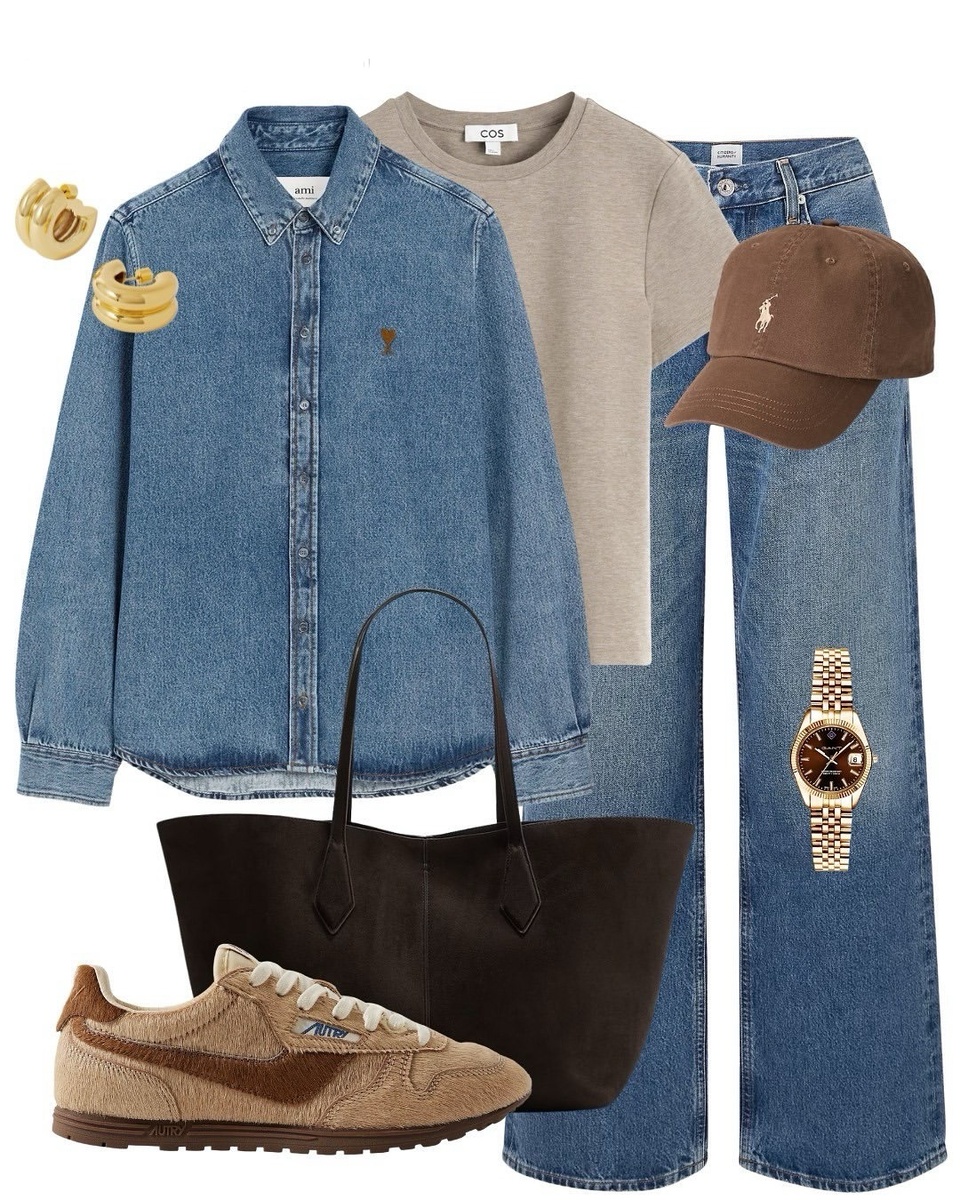 Осень — лучший сезон для «умной» многослойности и благородных фактур. На фото — идеальный повседневный сет в спокойной палитре денима, грейджа и шоколада. Он выглядит ненавязчиво, но очень статусно за счёт текстур: хлопок, замша, «пони»-кожа, золото. Разберём каждую находку по полочкам и соберём образ, который выдержит и дождь, и яркое офисное освещение, и субботний бранч.