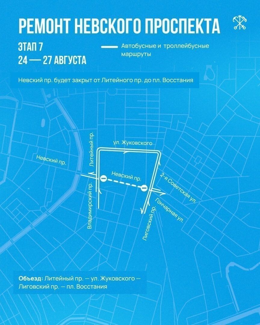 Движение транспорта будет закрыто на участке от Литейного проспекта до площади Восстания. Движение сохранится по площади Восстания без поворота на Невский проспект, а также будет открыто на перекрестке Невского проспекта с Литейным проспектом.