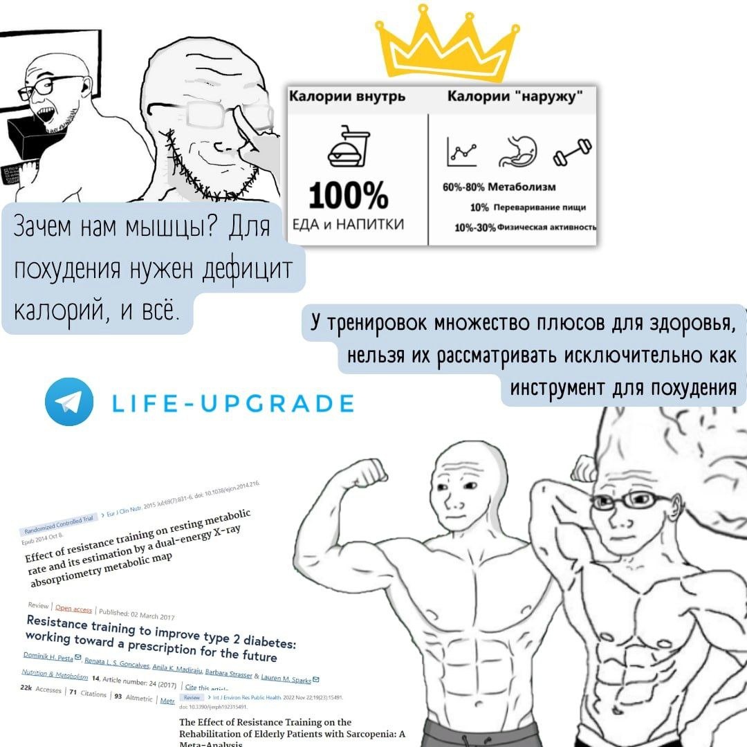 🤨Нужно ли ходить в зал, чтобы худеть? Нужды, то есть необходимости нет. Ведь похудение, то есть снижение количества жира в организме, это прежде всего вопрос баланса калорий, энергии. Можно просто поменьше есть. Однако силовые тренировки, в частности тренировки в спортзале, полезны для здоровья, для всех систем организма, и что очень важно, они стимулируют наши мышцы к росту, и позволяют в условиях дефицита энергии сохранять или даже наращивать (отдельная тема) мышечную массу. Вы можете спросить: "а зачем мне мышцы, я не бодибилдер?" Вернусь к теме здоровья. Ну, например, мышцы увеличивают чувствительность к инсулину, снижается риск получить диабет 2 го типа. (DOI:10.1155/2020/7694825) Так же мышцы потребляют много энергии даже в покое, (а тем более при активности), что позволяет вам больше есть без страха набрать жира. Плюс. Повышается хранилище гликогена. Вам можно есть больше углеводов без риска того, что они пойдут в жир. (PMID: 28270856, PMID: 8175496, PMID: 25293431) С воз