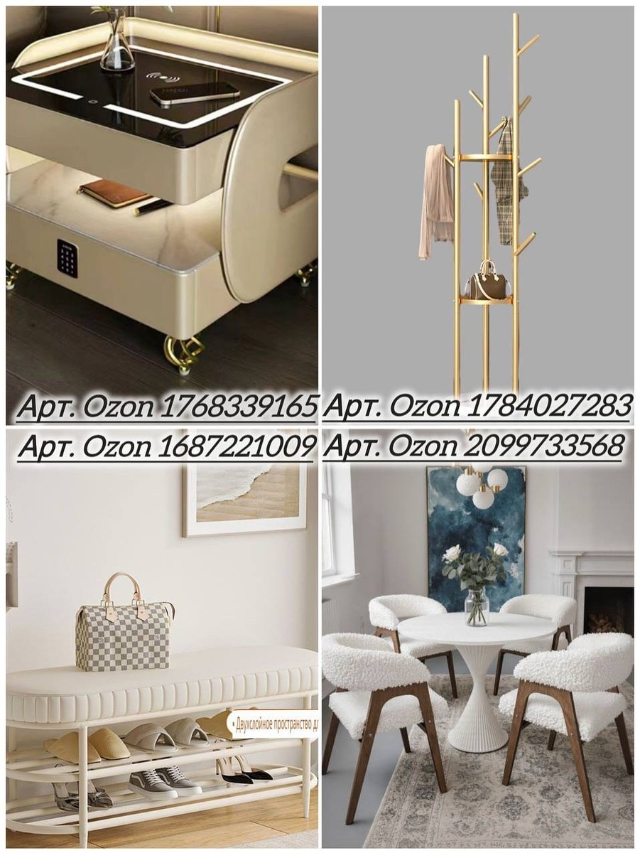 Эта подборка — настоящая капсула для интерьера. Здесь есть мебель, свет, декор и хранение: всё, чтобы дом выглядел стильно и гармонично. Я подробно разберу каждую находку: что это, куда поставить и как использовать, чтобы результат был как с Pinterest. Арт. Ozon 1768339165 Стильный столик с чёрной глянцевой столешницей, LED-подсветкой, полками и даже кодовым замком. Есть беспроводная зарядка — удобно для гаджетов. Совет: ставьте его сбоку от дивана, рядом с креслом и торшером — зона отдыха станет «сценой». Арт. Ozon 1784027283 Золотистая стойка для одежды и аксессуаров. Лёгкая, но функциональная. Совет: используйте одинаковые плечики — прихожая будет выглядеть «дороже». Арт. Ozon 1687221009 Практичное решение для прихожей: сиденье и сразу полки для хранения обуви. Совет: под неё положите узкий коврик — получится завершённая композиция. Арт. Ozon 2099733568 Белый круглый стол с культовой ножкой и кресла в букле на деревянных ножках. Совет: добавьте ковер на 50 см больше диаметра стола