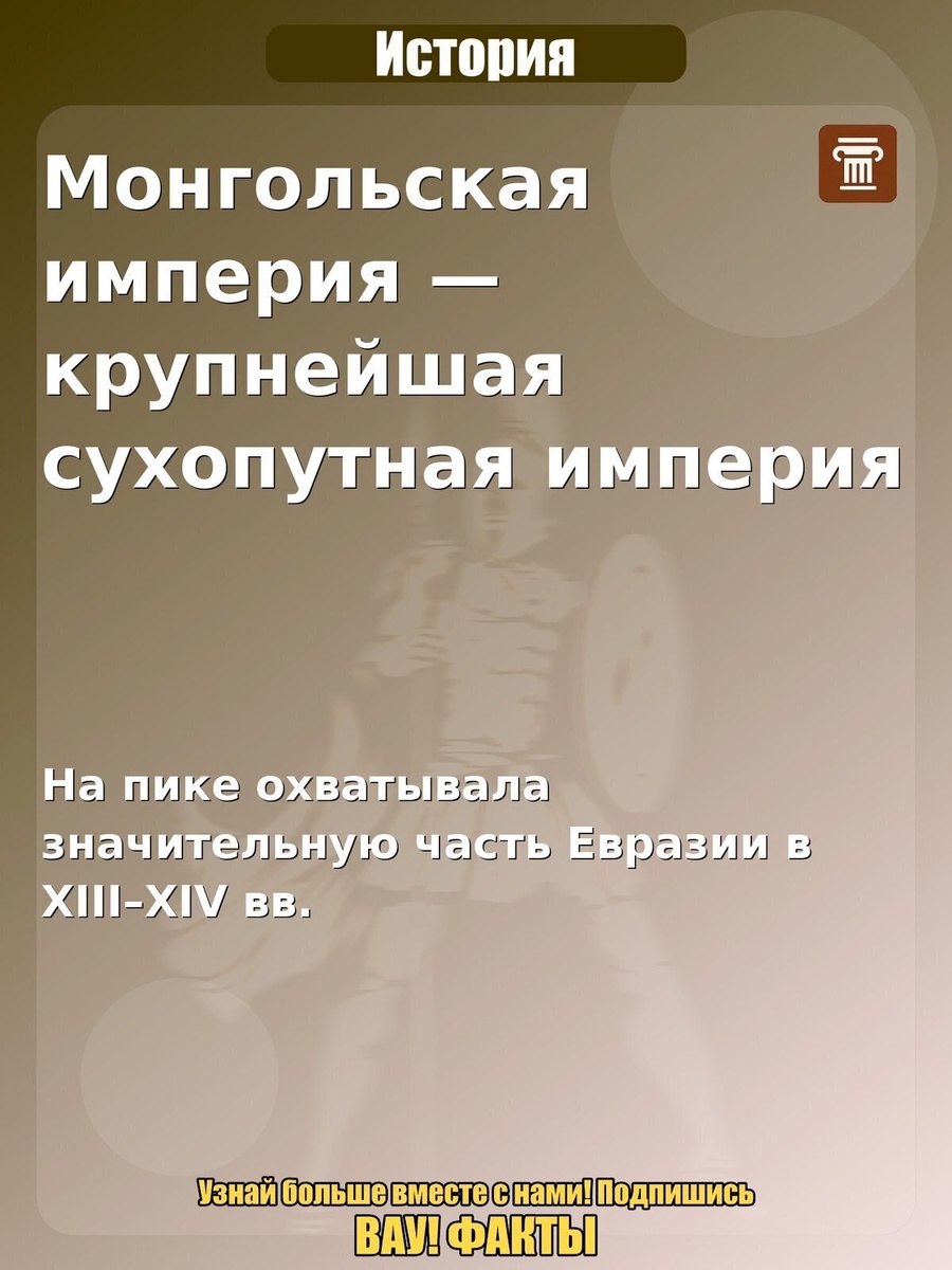 Монгольская империя — крупнейшая сухопутная империя. На пике охватывала значительную часть Евразии в XIII–XIV вв. Интересный факт по теме «История»: Монгольская империя — крупнейшая сухопутная империя. Почему так: На пике охватывала значительную часть Евразии в XIII–XIV вв.. Поделитесь в комментариях, знали ли вы об этом и стоит ли делать продолжение по теме. #история #факты #удивительно