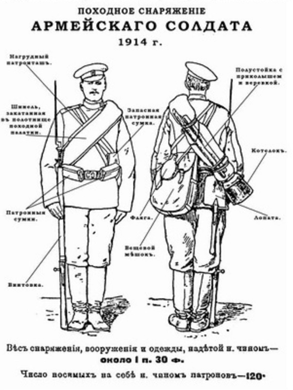 Походное обмундирование солдата 1914 г. состояло из суконной фуражки защитного цвета, защитного же цвета рубахи (суконной зимой и полотняной, пропитанной водонепроницаемым составом, летом), суконных шаровар (...), шинели серого сукна и сапог.