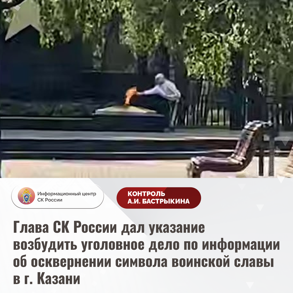 Глава СК России дал указание возбудить уголовное дело по информации об осквернении символа воинской славы в г. Казани В сети Интернет сообщается, что в августе текущего года в городе Казани женщина совершила действия, направленные на осквернение символа воинской славы – Вечного огня, установленного на территории мемориального комплекса в честь павших героев Великой Отечественной войны в парке Урицкого. В СУ СК России по Республике Татарстан по данному факту организована процессуальная проверка. Председатель Следственного комитета Российской Федерации Александр Иванович Бастрыкин дал указание руководителю СУ СК России по Республике Татарстан Валерию Андреевичу Липскому возбудить уголовное дело и представить доклад об установленных в ходе первоначальных следственных действий обстоятельствах, а по завершении расследования – о его результатах. Исполнение поручения поставлено на контроль в центральном аппарате ведомства. #СледственныйКомитет #СКРоссии #СКР #ИЦСКР #ИнформационныйЦентр #Алек