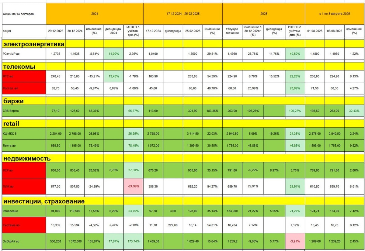Акции: анализ силы трендов Индекс полной доходности Мосбиржи с 30 12 2024г вырос на 6,8%. Анализирую фундаментал и тренды 77 компаний RU Полная EXCEL таблица с фундаменталом и портфелями https://t.me/c/1204004437/32970/94652 Описание VIP чата Как подписаться https://t.me/OlegDTrading/3939 В этом посте — только анализ трендов Зелёным фоном выделил акции, которые, с учётом дивидендов, выросли более 20% в 2024г. Оставил акции, которые с 30 12 2024г выросли более 20% Остальные акции скрыл. Красным фоном выделил названия акций, у которых опасный фундаментал (долг выше 3 EBITDA или отрицательный свободный денежный поток FCF или отрицательная листая прибыль). Оранжевым выделил акции, у которых опасный фундаментал (долг выше 3 EBITDA или отрицательный свободный денежный поток FCF или отрицательная листая прибыль). Также проанализировал поведение акций на двух трампоралли ВЫВОД Растущий тренд сохраняется Полюс Т-Банк Ренессанс С июля интересны тренды НМТП Хэдхантер