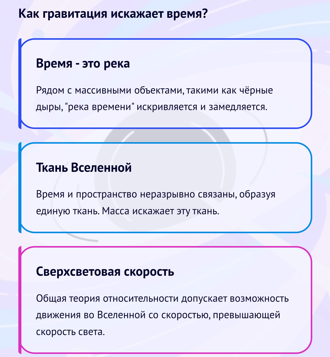 Почему? Потому что время неразрывно связано с пространством, образуя ткань Вселенной. Чёрная дыра своей огромной массой эту «ткань» искривляет, и из-за этого время рядом с ней течёт медленнее, чем, например, здесь, на Земле. Общая теория относительности допускает возможность перемещения по Вселенной со сверхсветовой скоростью.