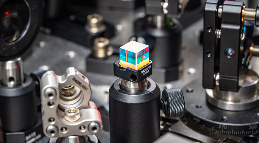 На фото: Крупный план куба с делителем луча (в центре), через который проходят лазерные лучи. Хавел и его команда направили короткие импульсы лазера, чтобы определить колебательные движения биологического объекта, такого как вирус, основываясь на его «звуке».