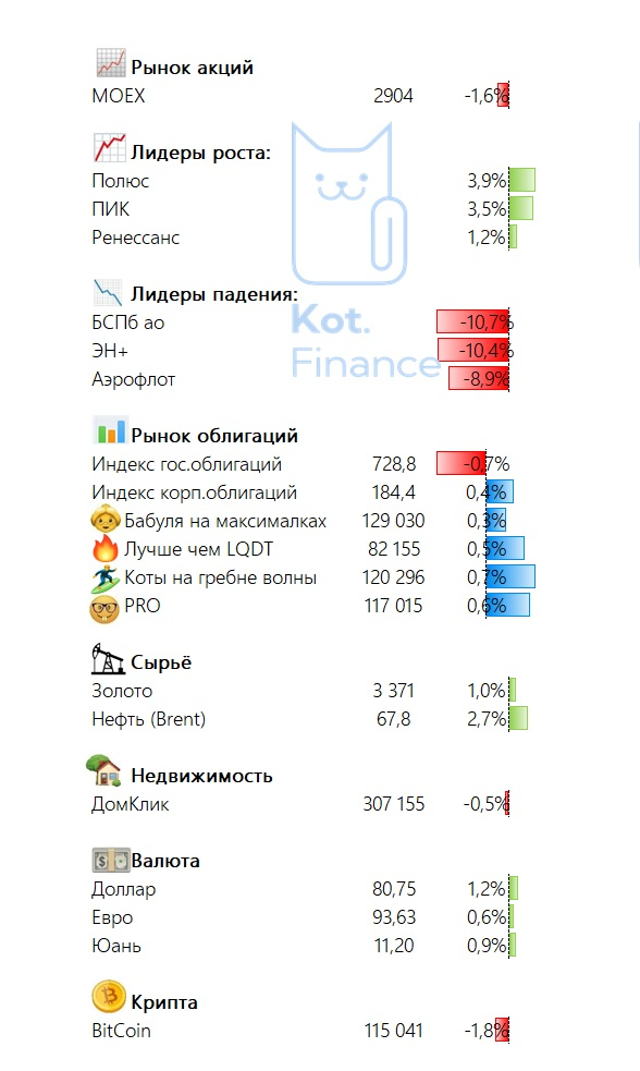 Еженедельный дайджест постов Кот.Финанс и инвестиционные итоги недели 💵Облигации • Борец перестал быть токсик? • особенности анализа строительных компаний: отличия РСБУ и МСФО • ГТЛК: update за полугодие МСФО • сам себе страховая: идея на грани инвестиционного портфеля и научпоп в сфере финансов • глобальное обновление в Кот.Финанс PRO. Теперь каждую неделю • новый кредитный рейтинг Рольф • НовосибирскАвтоДор. Кто ты: ВВВ или А-? 📈Акции • с Днем трейдера! Профессия, которая и опасна, и трудна • нервная неделя: влияла и геополитика, и данные по инфляци 🏡Недвижимость • еще не впитала снижение ставки. А может, 18% всё ещё слишком много? 💸Валюта $80,75 (+1,2%) €93,63 (+0,6%) ¥11,20 (+0,9%) 🆕Что-то новенькое • Разбираем, что такое краудлендинг