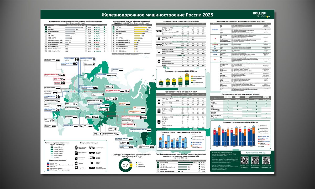 Россия: ROLLINGSTOCK Agency (RSA) выпустили обновленную версию карты, которая традиционно пользуется высоким спросом в отрасли. На ней отражены более 45 предприятий, занятых в выпуске рельсовой техники: локомотивов, пассажирского подвижного состава, грузовых вагонов, городского рельсового транспорта и путевых машин. Карта выпущена при поддержке энгельсского «Завода металлоконструкций» и будет распространяться 28-29 августа на международном железнодорожном салоне «PRO//Движение.Экспо» в Санкт-Петербурге. Также инфографика содержит: В печатной версии карта будет распространяться в традиционном альманахе ROLLINGSTOCK, посвященном российским и мировым трендам на железнодорожном транспорте, а также новинкам, которые представляются в экспозиции на «PRO//Движение.Экспо». Ранее в этом году уже выходили альманах и инфографическая карта RSA, посвященные городскому рельсовому транспорту. В свою очередь, железнодорожный альманах 2023 года доступен по ссылке. Полная версия третьего издания инфограф