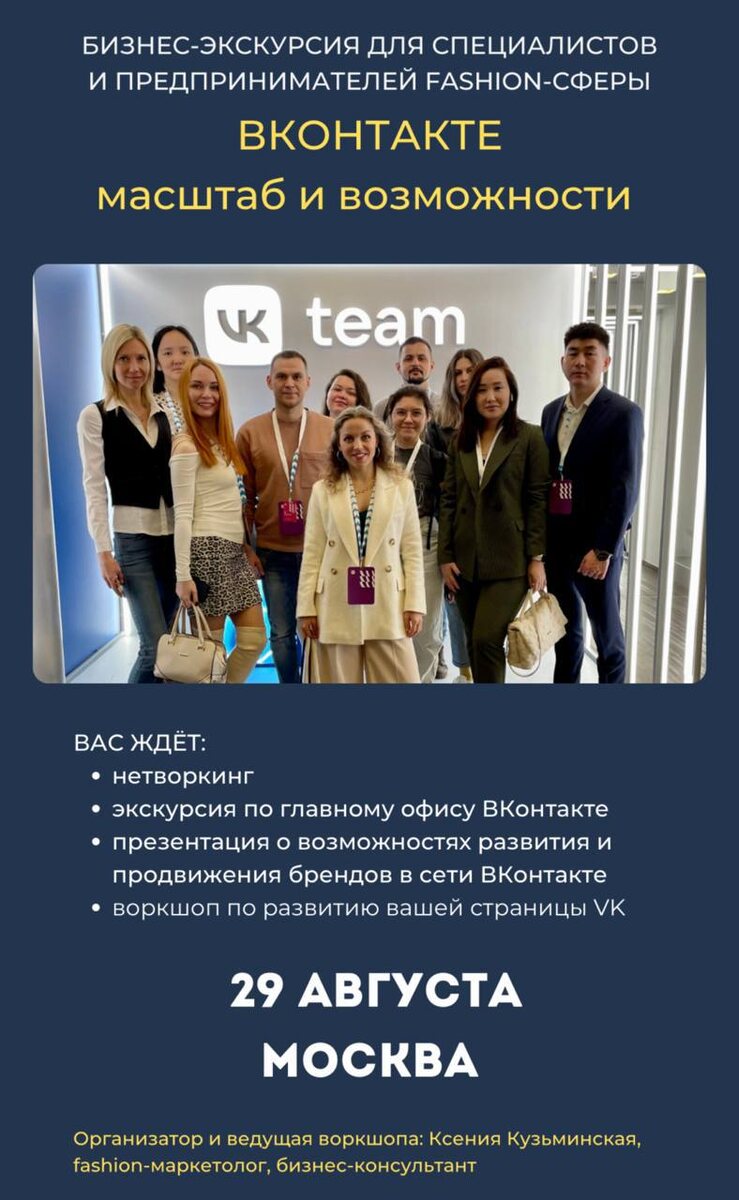ПОСЛЕДНИЙ ДЕНЬ регистрации на экскурсию и воркшоп в главный офис страны компании ВКонтакте. 25 августа последний день, когда вы можете зарегистрироваться. Просто так в офис ВКонтакте не попасть… поэтому используйте эту возможность для вдохновения от знакомства с успешным российским брендом. Вас ждёт: ✔️ нетворкинг ✔️ экскурсия по офису ВКонтакте и погружение в корпоративную культуру ✔️ лекция от представителя ВКонтакте о возможностях площадки для вашего бизнеса ✔️ воркшоп от Ксении с разбором и настройкой ваших страниц ВКонтакте Орг.взнос - 1000р Регистрация у @kuzminskaya_kseniya до 25.08.