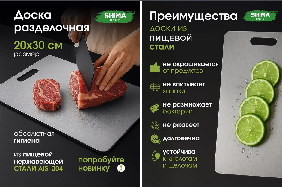 А что делать с сырым мясом, которое оставляет после себя следы? Так вот, я нашла идеальное решение — разделочная доска из нержавеющей стали. Она выглядит невероятно стильно и дорого, сразу создаётся ощущение, что ты на профессиональной кухне. Самое крутое, что она вообще ничего не впитывает — ни запахи, ни жир.