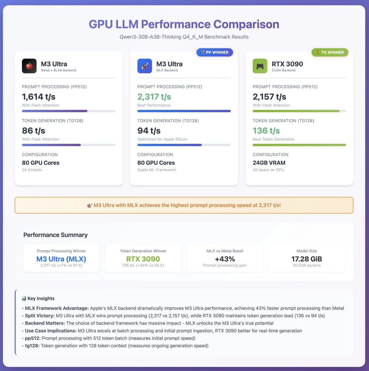 На Reddit кто-то сравнил новый Apple M3 Ultra с 512 гигабайтами памяти и старичка (карту) RTX 3090 для ИИ. См. картинку - кликабельная. Зачем? Как минимум поймете есть ли смысл запускать такие ИИ локально...
