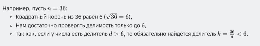 Необходимо определить, является ли данное натуральное число простым. Простое число — это положительное целое число большее единицы, которое делится нацело только на единицу и на само себя. Простое число имеет ровно два положительных делителя: единица и само число. Например, числа 2, 3, 5, 7 являются простыми, поскольку имеют только такие делители. Число 4 не является простым, потому что кроме единиц и самой четвёрки, у неё ещё есть делитель 2. Описание проблемы: Нам дано некоторое число n, и наша цель — выяснить, простое оно или нет. Классическое решение предполагает проверку делимости числа на все целые числа от 2 до n-1. Однако такой подход крайне неэффективен для больших чисел. Оптимизированный способ заключается в проверке делимости лишь до квадратного корня из n, потому что если у числа существует делитель больший, чем корень из n, то обязательно найдется меньший делитель, компенсирующий этот фактор. Поэтому, чтобы оптимизировать проверку, нам достаточно рассматривать потенциальны