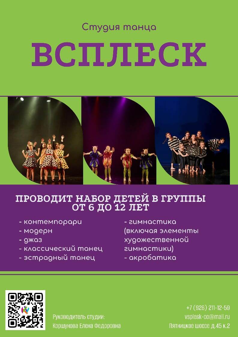 Всплеск талантов Студия танца "Всплеск" существует уже третий год во 2-м корпусе нашей школы, и наши девочки активно участвуют на конкурсах, завоевывают призовые места, участвуют во всех школьных праздничных мероприятиях. А совсем скоро они отправятся на свой первый выездной танцевальный фестиваль в Казань. Танец - это не только про движение, танец - это грация, тонкое чувство музыки, изящность и возможность рассказать любую историю через свое тело. В программу обучения входят такие дисциплины как контемпорари, модерн, джаз, гимнастика, акробатика. А лучше познакомиться с коллективом вам поможет группа в Вконтакте https://vk.com/contrast_vsplesk?from=groups Приглашаем всех желающих в нашу дружную команду! В конце августа будет запись на портале мос.ру, а также с 26 августа на охране будет тетрадь для записи. Елена Федоровна Коршунова, руководитель студии #школа1358 #ДОНМ #допобразование