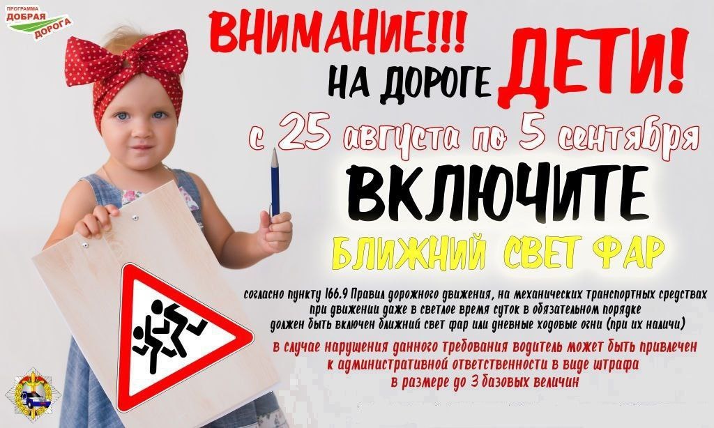 С 25 августа по 5 сентября в Беларуси пройдет акция «Внимание — дети!», направленная на повышение безопасности несовершеннолетних на дорогах В этот период водителям рекомендуется ездить с включенным ближним светом фар или дневными ходовыми огнями, чтобы привлечь внимание к проблеме и напомнить о необходимости быть особенно внимательными рядом с детьми. В последнюю пятницу августа состоится День безопасности дорожного движения под девизом «Безопасная дорога в школу — забота взрослых», приуроченный к началу учебного года. В первые дни сентября сотрудники правоохранительных органов усилят контроль вблизи школ, уделяя особое внимание перевозке детей, соблюдению правил пересечения проезжей части взрослыми с детьми и предоставлению преимущества пешеходам.