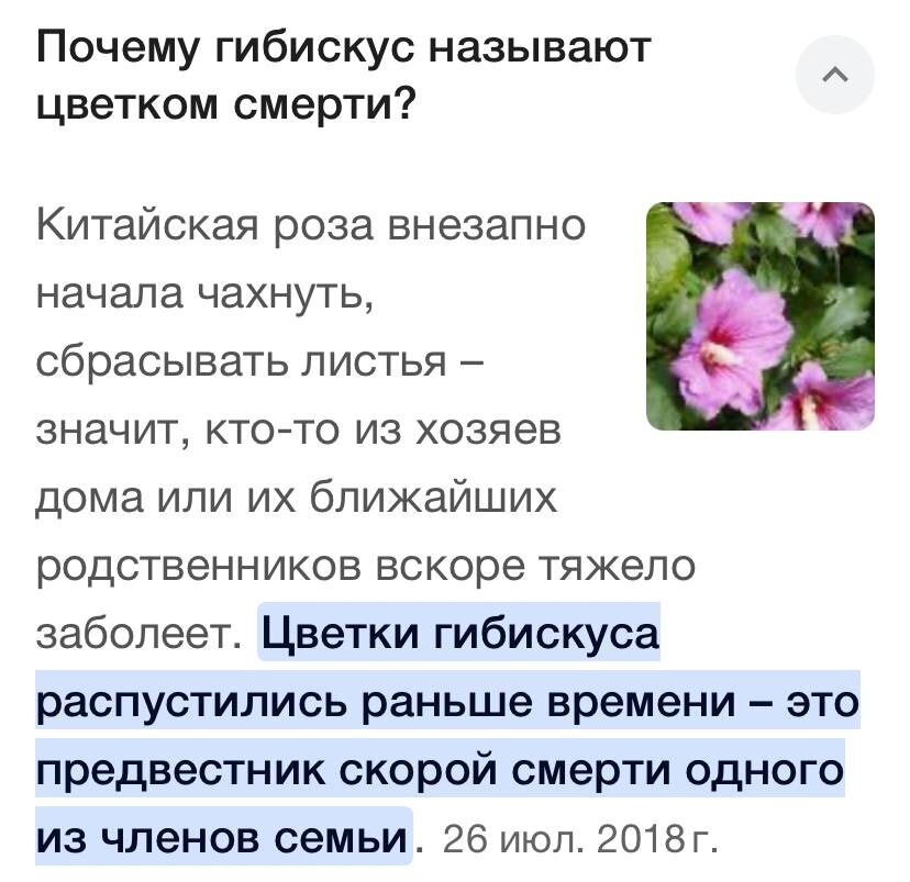 Два дня тому назад дочь купила Китайскую розу - Гибискус. Хотела подарить мне, но решила заменить землю и горшок. Я люблю светлые горшки, она знает. Роза высокая - 65 сантиметров. Горшок нужно выбрать тоже большой. Стала дочь изучать всё об этом цветке. И, начитавшись, решила пока оставить у себя. А прочитала вот что. Информация из интернета А что страшного? Чему быть, того не миновать. Дочь решила поэкспериментировать и поставила цветок на балкон. Роза на балконе у дочери Информации много разной, но больше хорошей. Информация из интернета Разве такая красота может нести плохую энергетику?! Информация из интернета Хочу сказать, что Китайскую розу мне пришлось купить в 1959 году, когда нам дали большую комнату в общежитии. Мы жили тогда в Дзержинске, Донецкой области. Из мебели у нас было две кровати и шкаф. Большая комната в ней 2 окна, светлая и я решила купить розу и фикус. На окнах были у самого стекла небольшие занавески ришелье, а потом тюль на в