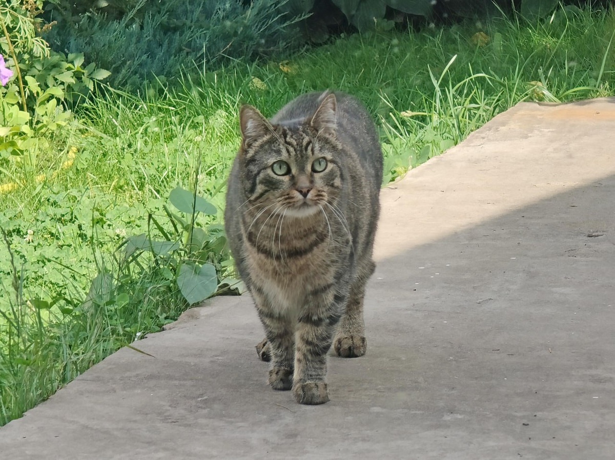 Серополосатое с интересом смотрит на домик с кормушечкой, но почему-то никогда туда не лезет. Не то сытое, не то боится не запрыгнуть, не то боится огрести от чёрного, который считает его своим. Всё сложно, в общем.
