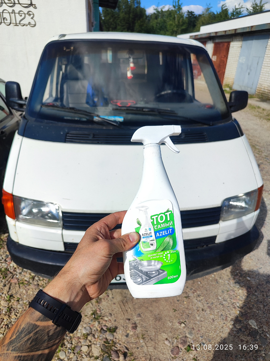 Пластиковые дверные карты и панель мои трудяги Т4 выглядели уж совсем "уставшими". Решил как то их отмыть. Ребята перекупы подсказали, что лучше всего с этим делом справляется средство для удаления жировых пятен под названием "Азелит". Приобретаю это средство в ближайшем магазине бытовой химии и сразу же за дело. На флаконе со средством имеется распылитель, что существенно облегчает нанесение "Азелита" на обрабатываемую поверхность. Моющее средство выходит в виде пены. Что меня удивило, так это то что средство начинает работать моментально. Буквально за пару секунд грязь вместе с пеной начала стекать с дверных карт Для большего эффекта я решил повторить процедуру нанесения пены и смятия несколько раз. Что и стало, на самом то деле ошибкой. Средство данное ну очень уж сильное и с лёгкостью отмывает любые загрязнения, однако есть нюанс. Если средство нанести неравномерно и передержать , то образовываются подтёки. Во избежании подтёков, лучше всего наносить "Азелит" на моющую губку ил