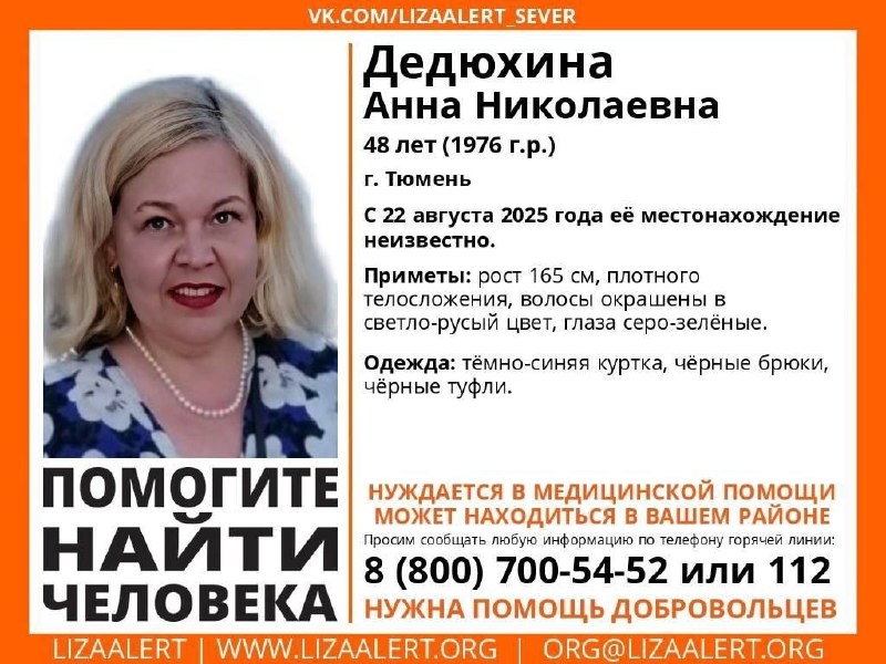 🚨 ВНИМАНИЕ! ПОМОГИТЕ НАЙТИ ЧЕЛОВЕКА! Пропала Анна Николаевна Дедюхина, 48 лет 📍 г. Тюмень С 22 августа 2025 года её местонахождение неизвестно. 📞 Инфорг: Ксения (Брик) 8-992-311-09-01 ❗Комментарии для СМИ: координатор/инфорг поиска или пресс-служба «ЛизаАлерт» (Екатерина, 8-996-320-04-09). Запрос на согласование фото- и видеосъёмки: горячая линия 8-800-700-54-52. 🙏 Просьба распространять информацию!