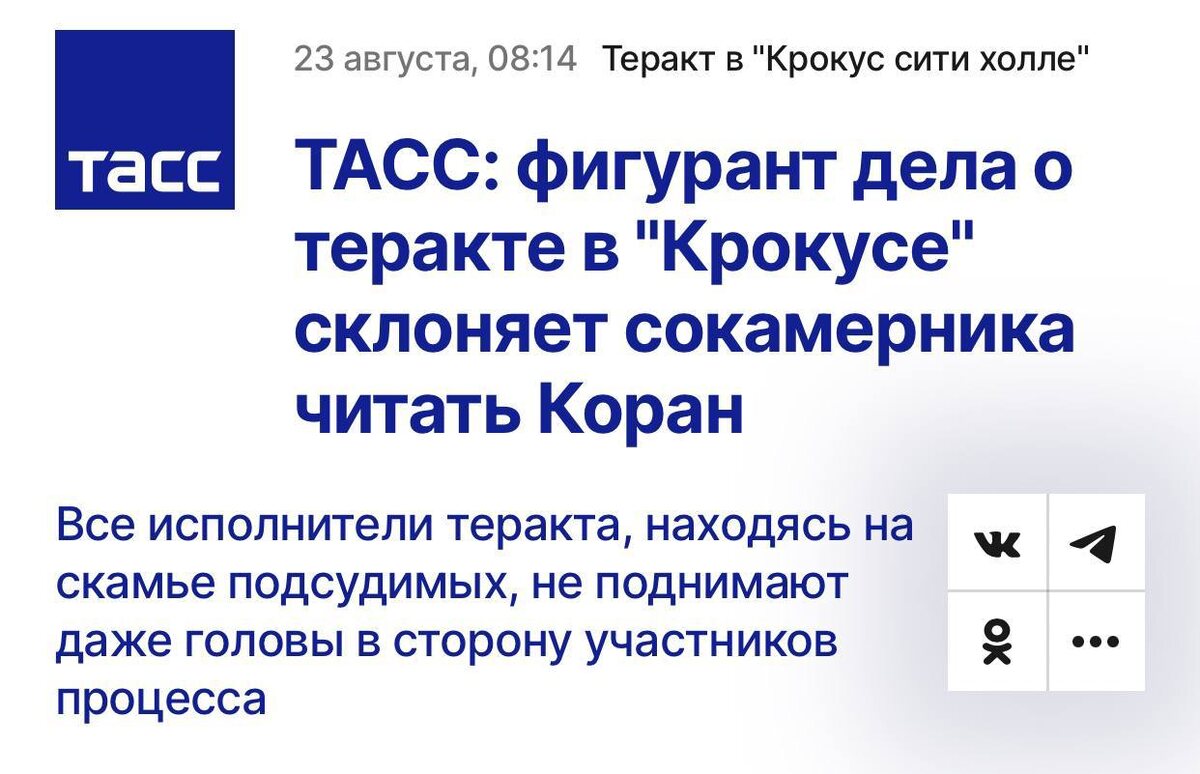 Преступник-мигрант, попадающий в СИЗО или тюрьму, возвращается как в дом родной: "тюремный джамаат" с распростёртыми объятиями "Фигурант уголовного дела о теракте в концертном зале «Крокус Сити Холл», жертвами которого стали 149 человек, постоянно читает Коран, совершает в СИЗО молитвы, а также агрессивно склоняет своего сокамерника, который обвиняется в преступлениях террористической направленности по другому делу, принять Ислам". Тем не менее власти ранее полностью отрицали религиозный мотив преступления, сославшись только на материальный.