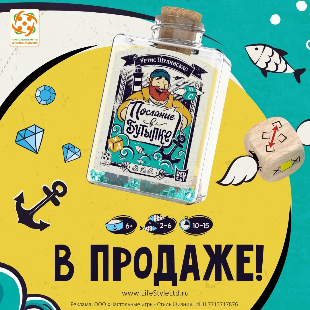 Неужели это случилось снова? Да! К берегу пришвартовалась бутылка с посланием. Ого! Пиратские сокровища? Тайные послания? Любовное письмо? Что там такое? К сожалению, бумага всё же размокла в воде, и вы смогли разобрать лишь несколько отдельных букв. Получится ли у вас расшифровать послание полностью? Н, О, В, Ч... Возможно, это было слово "Вечность"? 🌀 "Послание в бутылке" вернулась в продажу! Первый тираж моментально смели с полок магазинов. Но всё хорошее имеет свойство возвращаться! "Послание в бутылке" – завораживающая игра в необычном дизайне. В прозрачной бутылочке вы найдёте сияющие кристаллы и загадочные кубики с буквами. Хорошенько встряхните сосуд, чтобы узнать, какие сочетания открылись вам в этот раз. Задача каждого из игроков: быстрее остальных назвать слово, в котором есть все буквы на верхних гранях кубиков. Если игрок справился, он забирает кристалл себе. Ошибся – увы, добычу придётся вернуть. Правилами предусмотрены разные режимы игры, так что каждая партия может