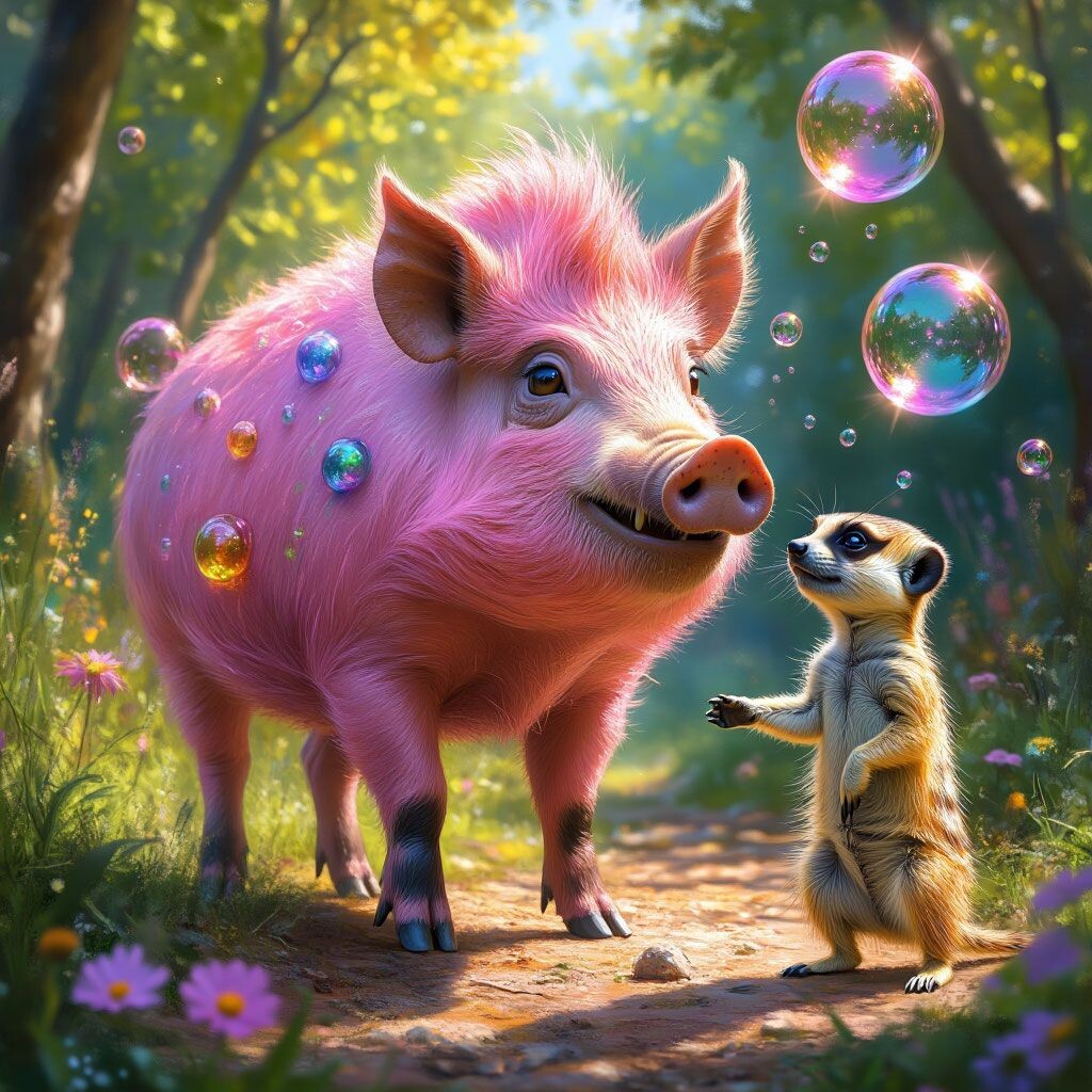 В одном волшебном лесу, где деревья шептали древние тайны, а цветы светились в темноте, жил необычный кабанчик по имени Пуфик. Его розовая шкурка переливалась в лучах солнца, а хвостик-крючок забавно подёргивался, когда он был счастлив. Но у Пуфика была одна особенность — он постоянно пукал, и эти звуки разносились по всему лесу, заставляя других зверей хихикать и показывать на него пальцами. Из-за этого кабанчик часто прятался в своей уютной норке, выстланной мягкими листьями и украшенной блестящими камешками. Он любил наблюдать за бабочками через маленькое окошко и мечтать о настоящих друзьях. Однажды злой колдун Грымзик, с длинной седой бородой и крючковатым носом, проходил через лес. Он был известен своими жестокими шутками и ненавидел, когда кто-то был несчастен. Увидев одинокого Пуфика, Грымзик решил подшутить над ним. Он прошептал заклинание, и с тех пор каждый раз, когда Пуфик пытался подойти к другим зверям, из его пятачка вылетали разноцветные мыльные пузыри, которые лопалис