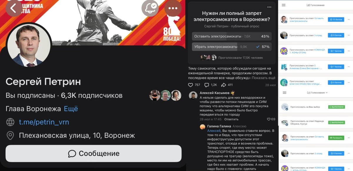 С 28 июля в официальном сообществе главы городского округа г. Воронеж Сергея Петрина проводится опрос граждан по теме: «Нужен ли полный запрет электросамокатов в Воронеже?». Очень странный способ решать инфраструктурный вопрос голосованием в ВК. Особенно если данное решение будет приниматься с учетом опроса, где заинтересованные предприниматели в неограниченном количестве «накручивают» нужный им результат. Уделив всего несколько минут текущим результатам этого опроса становится ясно что решение оставить электросамокаты в Воронеже будет принято лицами никаким образом не связанными с нашим городом - Дмитрий из Яхромы, Анастасия из Газ-Сале, Рисколана из Краснодара… фейками и дешевыми накрутками! Да, может и не стоит поспешно отказываться от прогресса. Такой уровень мобильности по городу никакой другой транспорт не дает, учитывая пробки и ситуацию с общественным транспортом. Но принимать те или иные меры за счёт опроса в социальных сетях?! Хотелось бы видеть вариант оборудования инф