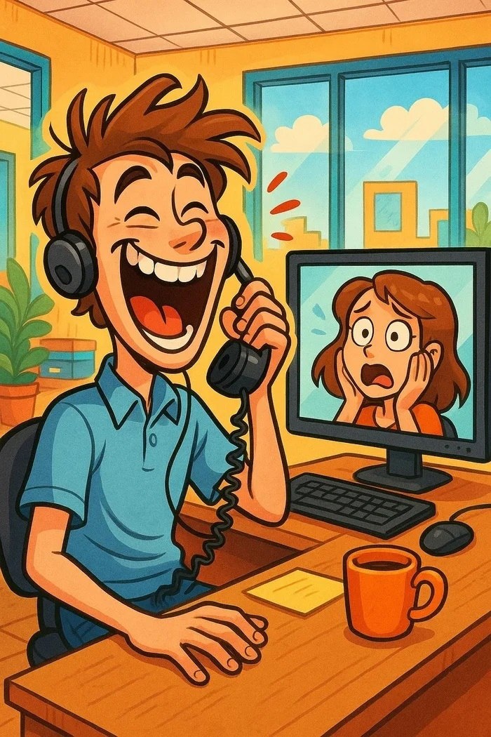 Смеяться на работе запрещается Короче, история про моего друга, которая могла бы стать мемом года. Решил он устроиться в службу поддержки клиентов. Позвонил, прошёл собеседование буквально за полчаса — и его берут на работу в тот же день. Он думает: «Ну всё, теперь я взрослый человек, официально могу говорить “Спасибо за ожидание, держитесь на линии”». Приходит в офис — а там полный хаос: разноцветные проводки, кнопки, наушники, экран мерцает, а на столе стоит термос с подозрительным кофе, которое, кажется, живет своей жизнью. Он садится, готовится к первому клиенту, думает: «Буду вести себя как профессионал, все по инструкции». Первый звонок проходит гладко, он улыбается, шутит, клиентка вроде довольна. Но потом она называет своё имя… И это его лучшая подруга! Та самая, с которой они делили пиццу на парах, вместе смеялись над учёбой и которая вообще не знала, что он теперь «официант счастья в мире телефонной поддержки». Он пытается говорить спокойно, но потом не выдерживает и н